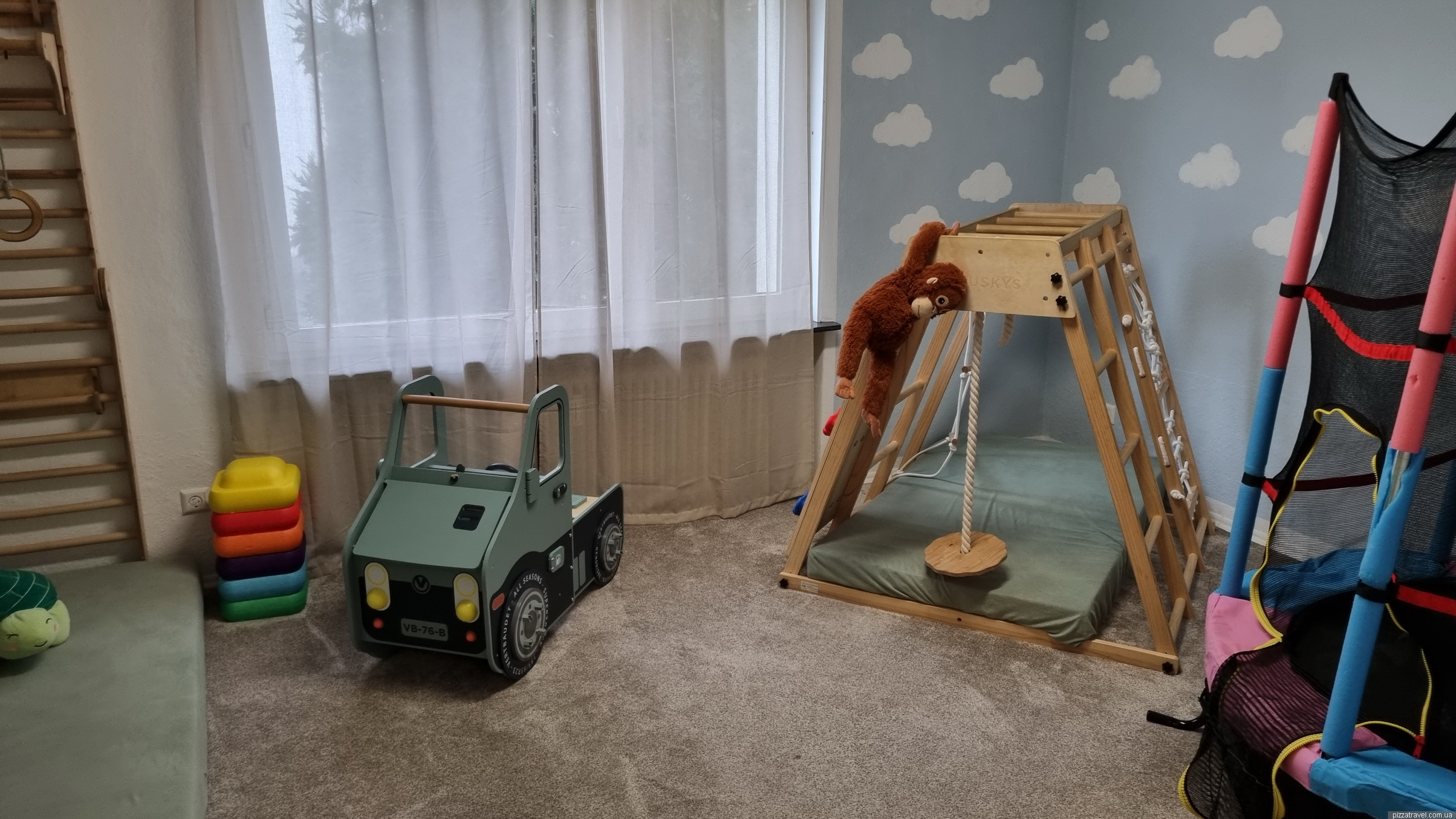 In summer they put entertainment for children, sandpit, toys, bouncy castle on the territory.