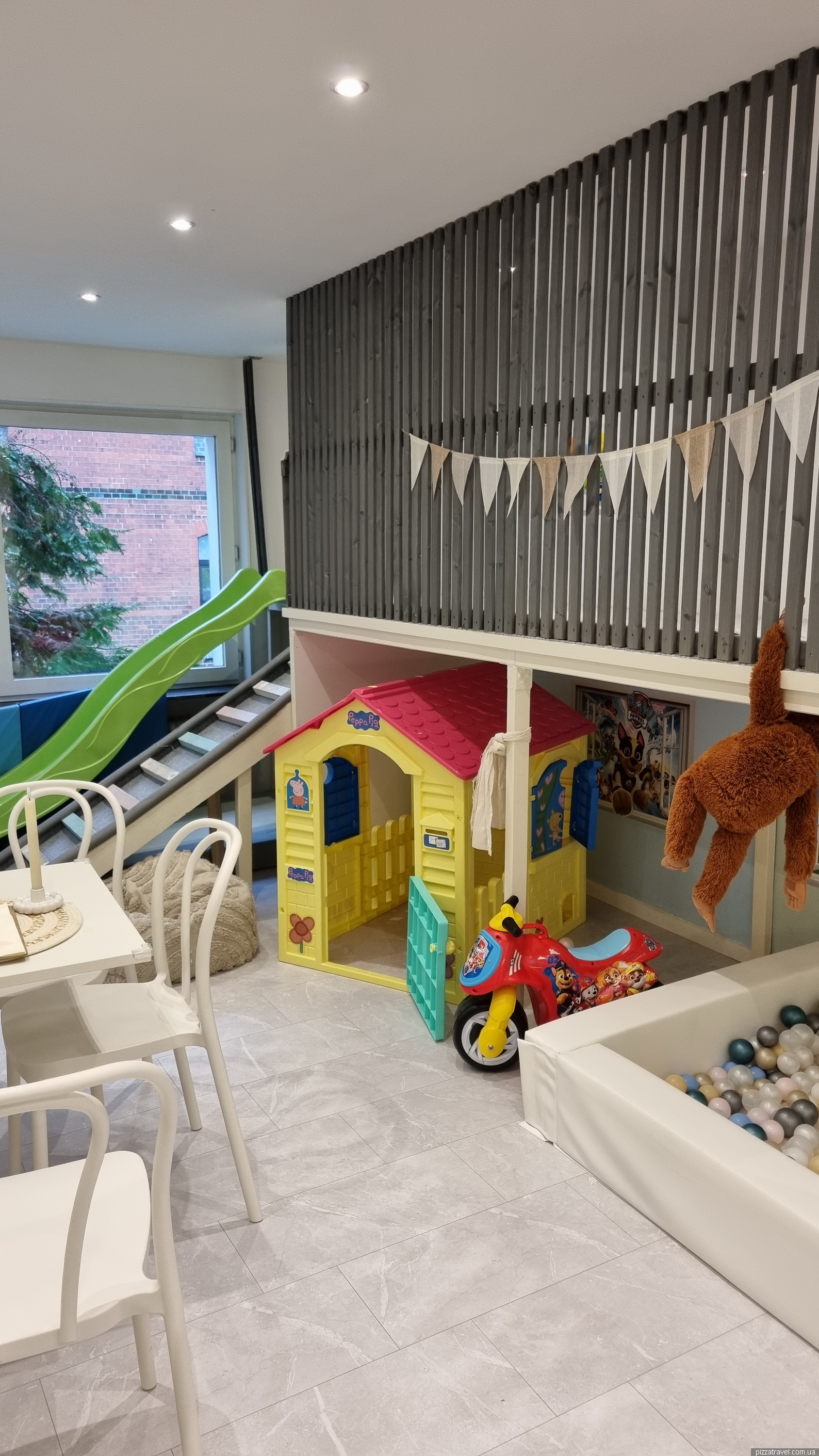 The restaurant is in the forest, there is a small playground and children's corner.