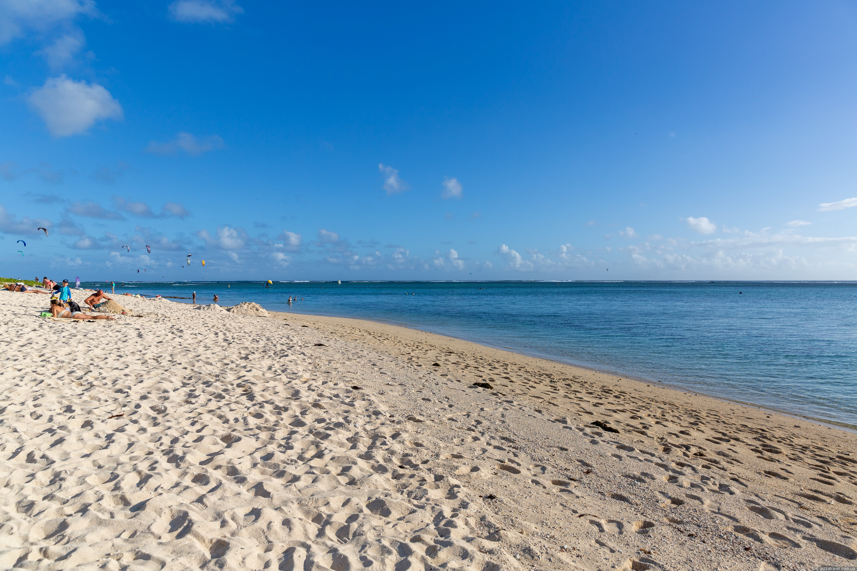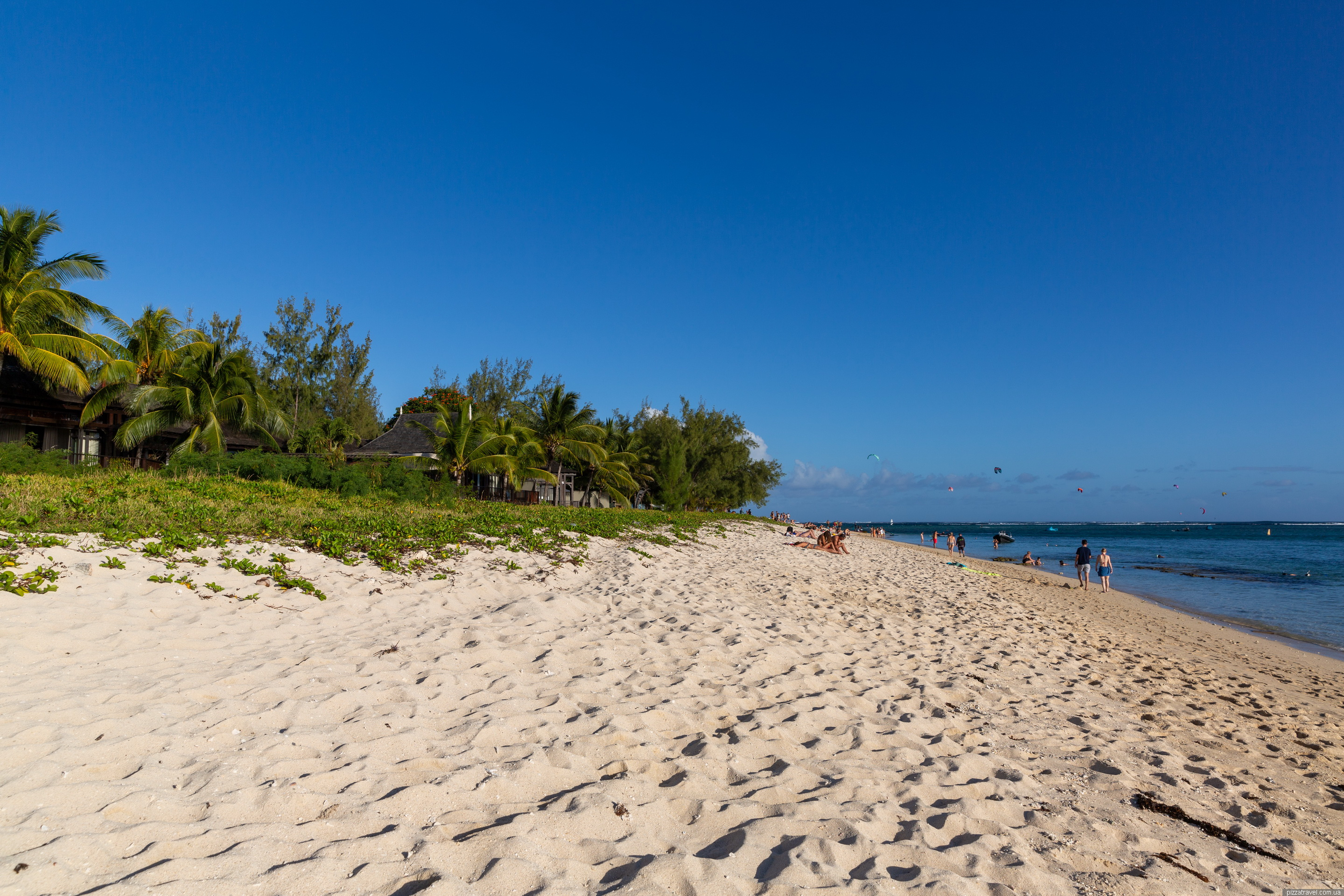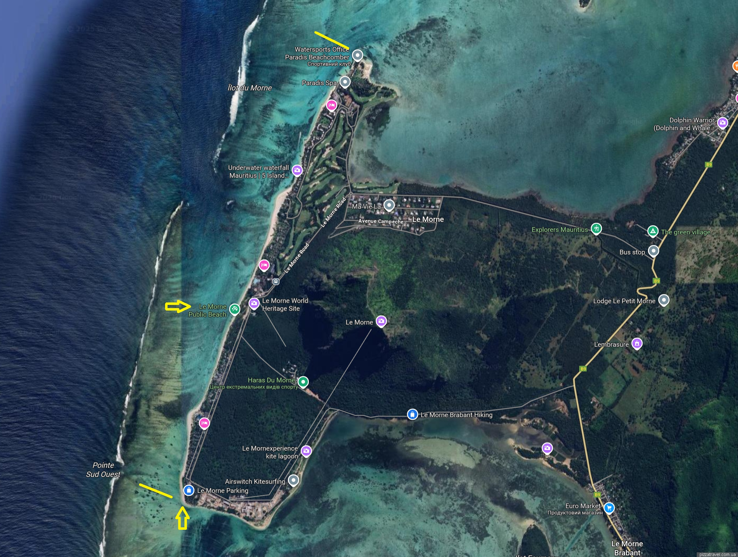Практично все узбережжя займають готелі, під'їхати до пляжу можна в двох місцях. Основна парковка, в центрі, -20.452083, 57.313750 і парковка для віндсерферів, на півдні, -20.465472, 57.308944. Ми купалися саме в другому місці, ось тут -20.464583, 57.308389, бо нам сюди було легко дійти пішки з готелю.